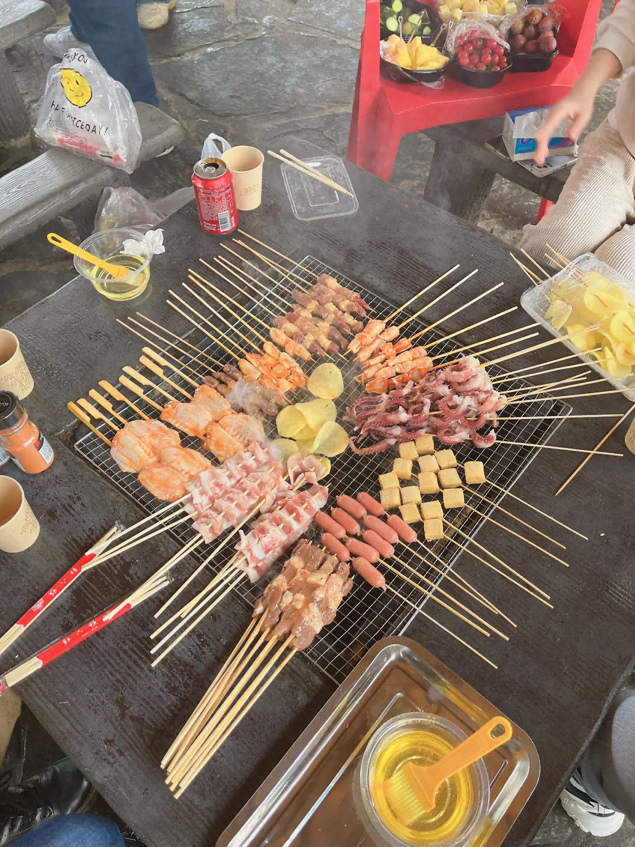 中午燒烤時刻,雖然小雨滴滴,但是并未影響大家的心情,相反茅草屋外雨戚瀝,更添上了幾分春游趣味。