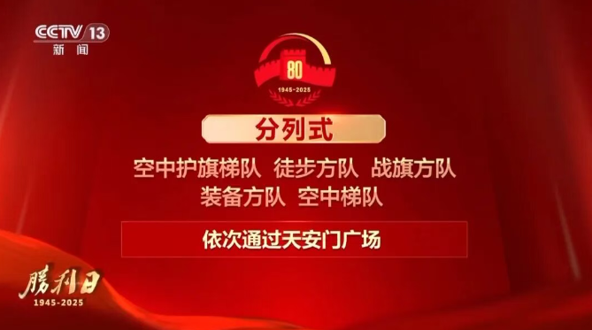 分列式環(huán)節(jié),按空中護(hù)旗梯隊(duì)、徒步方隊(duì)、戰(zhàn)旗方隊(duì)、裝備方隊(duì)、空中梯隊(duì)的順序,依次通過(guò)天安門廣場(chǎng)。