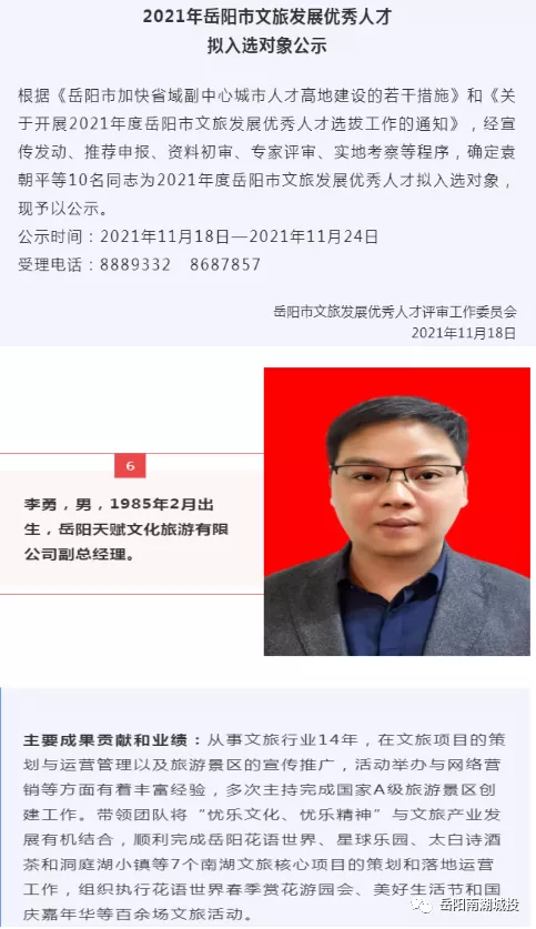 2021年11月,李勇被確定為2021年岳陽市文旅發(fā)展優(yōu)秀人才擬入選對象。對于能入選岳陽市旅游人才這一榮譽(yù),李勇表示:在南湖城投的帶領(lǐng)下,以天賦文旅品牌為中心,將進(jìn)一步豐富旅游業(yè)態(tài),滿足各類游客旅游體驗(yàn),合作各大旅游平臺,導(dǎo)流全國旅游消費(fèi)群體,吸引周邊城市人群,搶抓創(chuàng)建國家級旅游度假區(qū)的大好契機(jī),為岳陽樓洞庭湖旅游度假區(qū)建設(shè)再立新功。