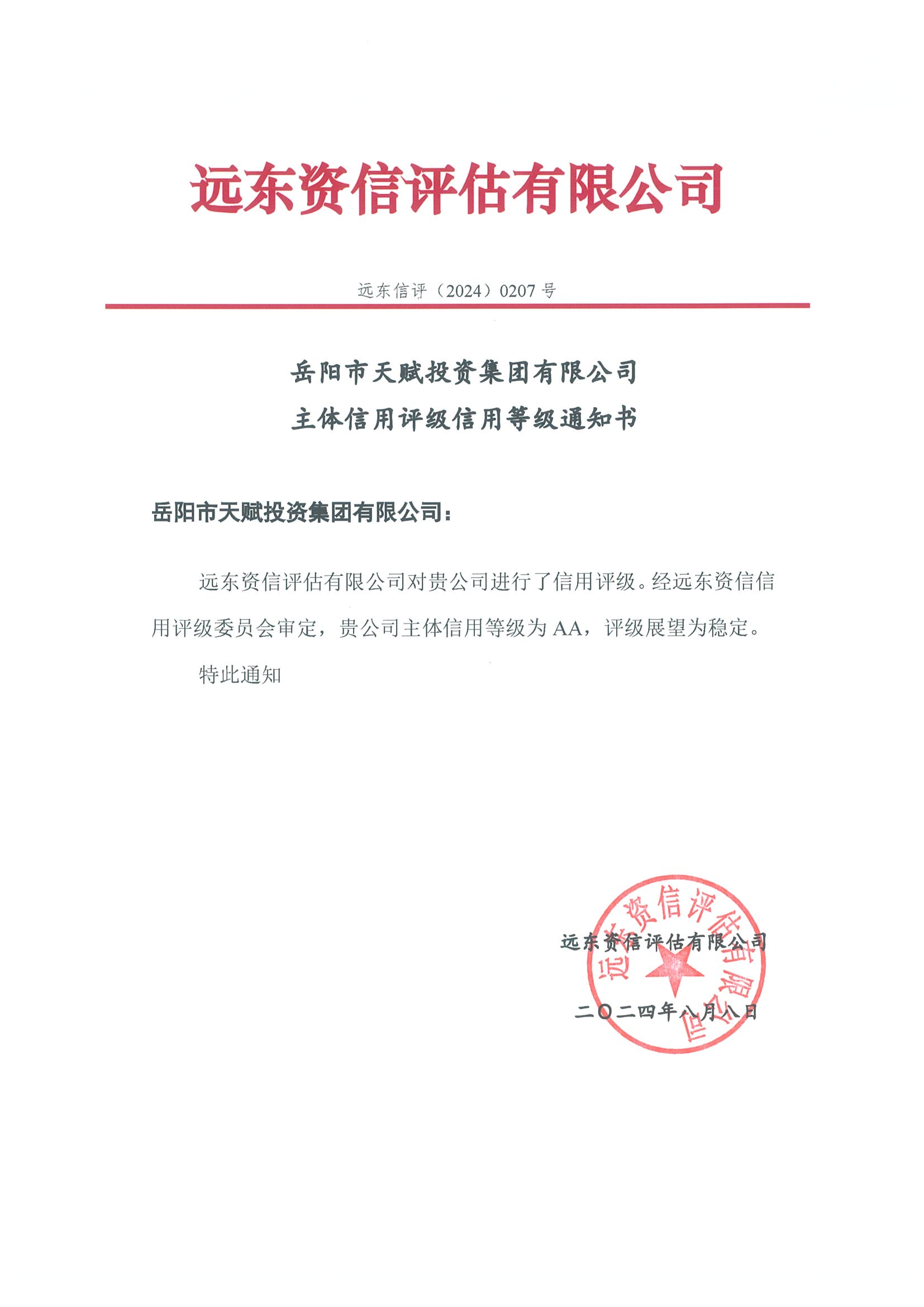 2024年8月8日,經(jīng)國內(nèi)權威評級機構遠東資信評估有限公司綜合評定,岳陽市天賦城市發(fā)展集團有限公司獲評AA+主體信用等級,成為岳陽市第五家獲得AA+信用等級的市屬國企;岳陽市天賦投資集團有限公司獲評AA主體信用等級,是岳陽地區(qū)唯一一個獲得AA主體信用評級的產(chǎn)業(yè)類投資企業(yè)。