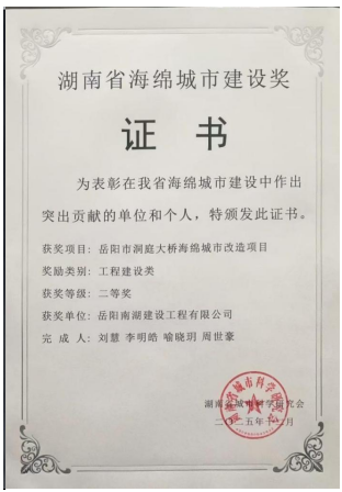 近日,由我集團(tuán)下屬岳陽(yáng)南湖建設(shè)工程有限公司建設(shè)的洞庭大橋海綿城市項(xiàng)目,經(jīng)岳陽(yáng)市住建局推薦申報(bào),榮獲湖南省城市科學(xué)研究會(huì)頒發(fā)的工程建設(shè)類二等獎(jiǎng)。這份榮譽(yù)既是對(duì)項(xiàng)目建設(shè)品質(zhì)的高度認(rèn)可,更是對(duì)公司專業(yè)實(shí)力與專業(yè)技術(shù)水平的充分肯定。
