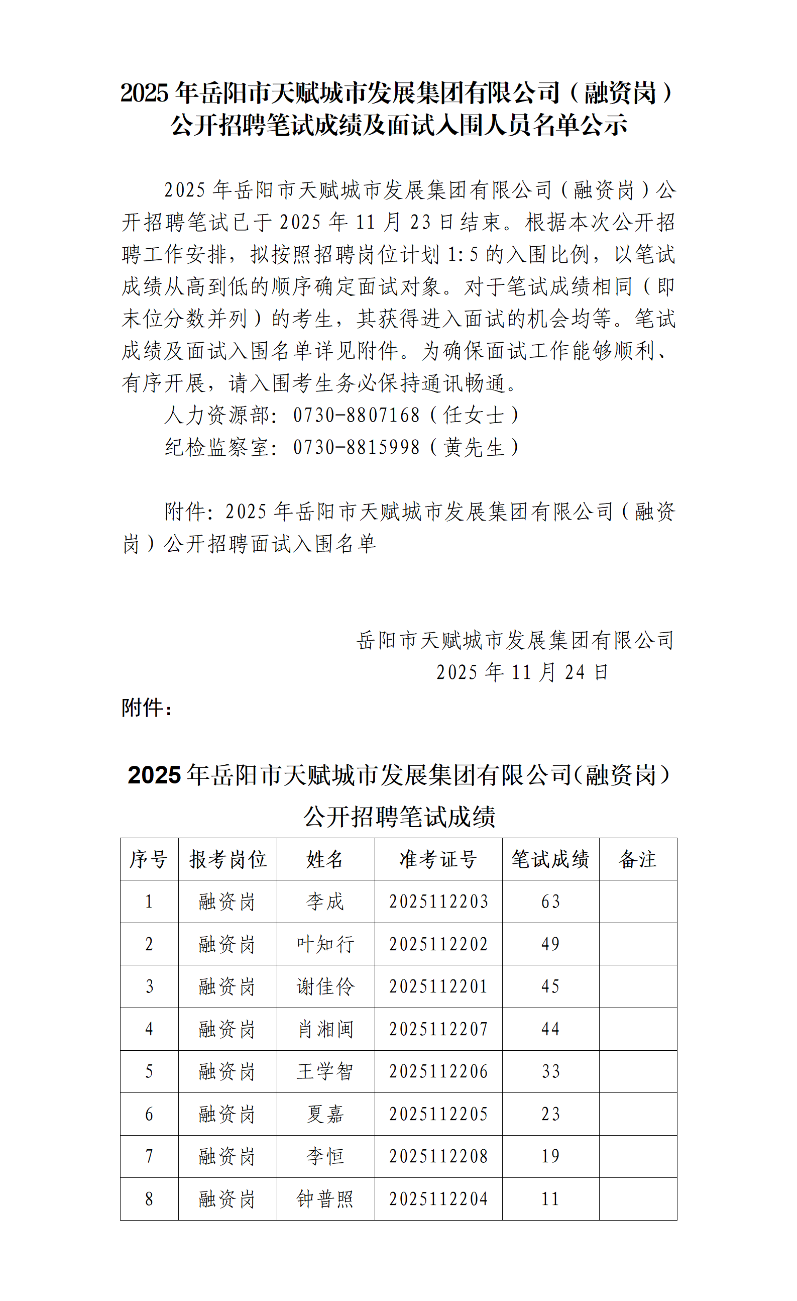 2025年岳陽(yáng)市天賦城市發(fā)展集團(tuán)有限公司(融資崗)公開(kāi)招聘筆試成績(jī)及面試入圍人員名單公示