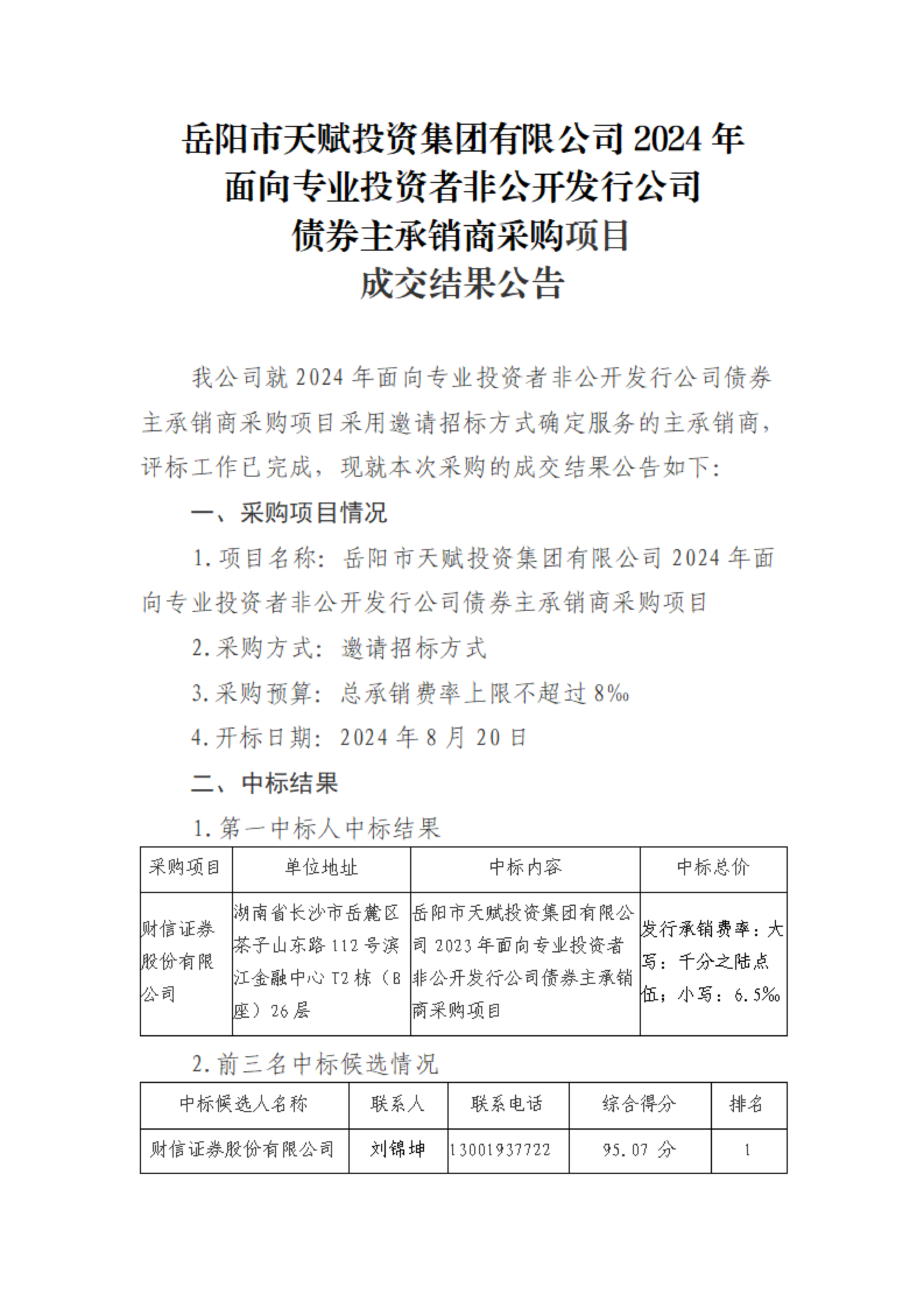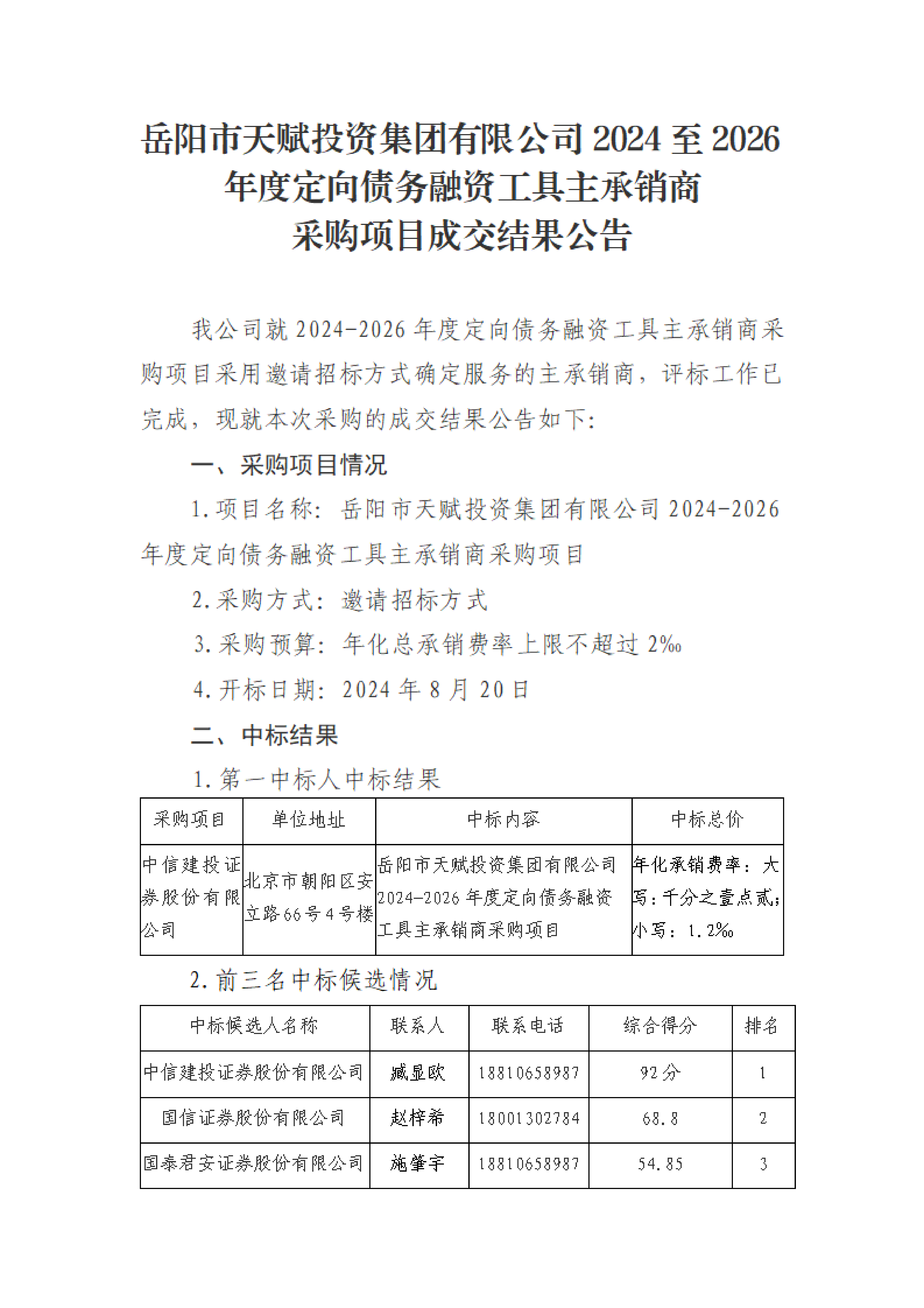 岳陽(yáng)市天賦投資集團(tuán)有限公司2024年面向?qū)I(yè)投資者非公開(kāi)發(fā)行公司債券主承銷(xiāo)商采購(gòu)項(xiàng)目成交結(jié)果公告