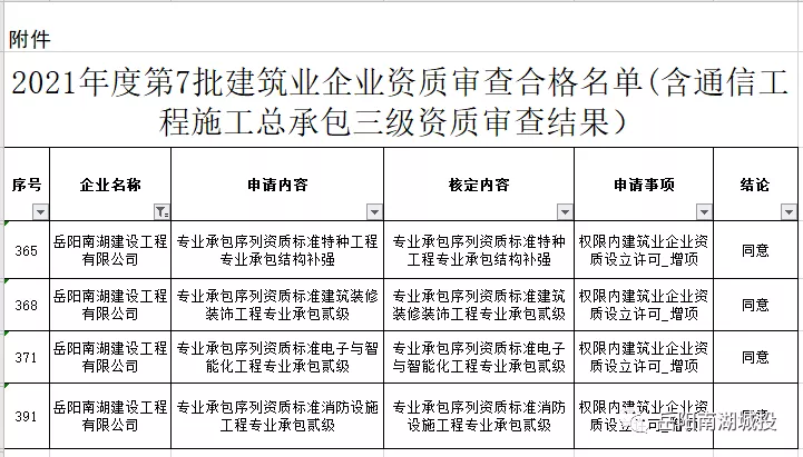 近日,湖南省住房和城鄉(xiāng)建設(shè)廳發(fā)布《關(guān)于2021年度第7批建筑業(yè)企業(yè)資質(zhì)審查合格名單的公告》,岳陽南湖建設(shè)工程有限公司成功獲得特種工程(結(jié)構(gòu)補強)專業(yè)資質(zhì)貳級、建筑裝飾裝修工程專業(yè)資質(zhì)貳級、電子與智能化工程專業(yè)資質(zhì)貳級、消防設(shè)施工程專業(yè)資質(zhì)貳級4項資質(zhì),這是南湖建工公司資質(zhì)維護管理取得的又一項重大成果。