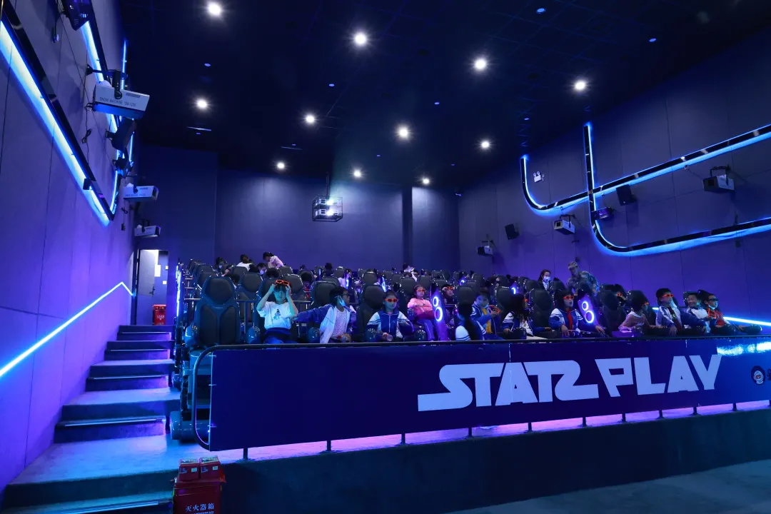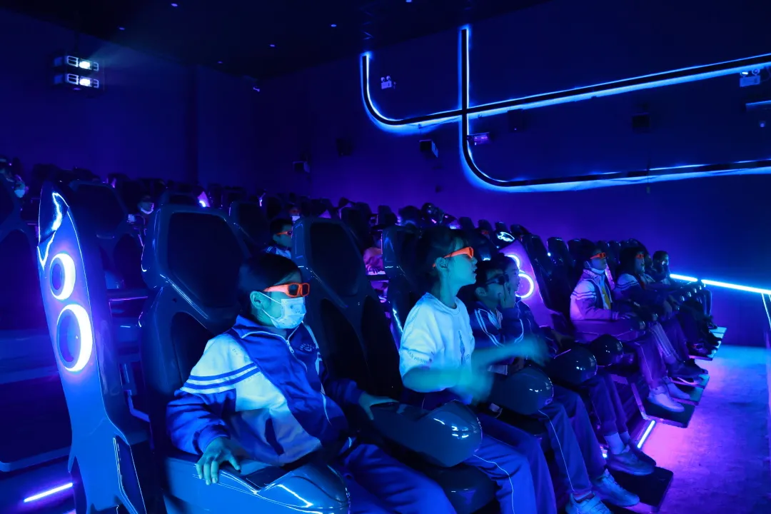 同學們來到了集視覺、聽覺、觸覺于一體的沉浸式5D影院—超級星劇場